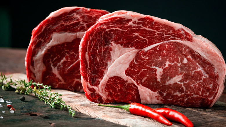 Marbling is largely dependent on the feed of the cow and the location of the cut on the cow's body. The degree of marbling inversely correlates to the amount of use the muscle receives, MasterClass explains. Muscles that don't get engaged as frequently, like the loin, have more marbling. Heavily used, leaner muscles, like the leg or rump, are less marbled. Typically, you'll also see much less marbling in grass-fed steak compared to conventional, grain-fed cows. While this may mean less moisture when cooked, grass-fed beef tends to have a more "robust" taste, making it a unique (and healthier, says WebMD) option to add to your next barbecue.