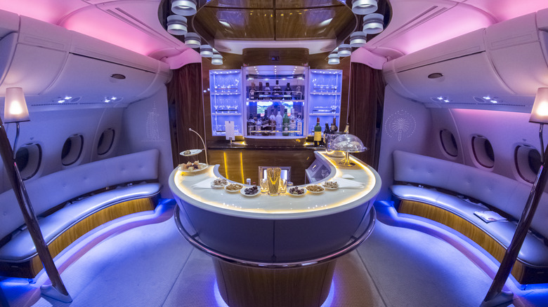 The Richest rates Emirates as the second-most luxurious airline because of its luxe first-class style, and "posh" doesn't even begin to describe the generous onboard cocktail lounge in business class. The bar is glossy wood, with mirrors, chrome, and lights, and drinks are served in real glasses with flair. Travel + Leisure divulges that the lounge is the perfect place to stretch your legs or relax on one of the leather couches encompassing the space.