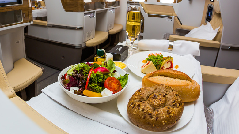 Depending on the route, midday meals and snacks are served shortly after departure, followed by a generous evening meal. Dinner includes alcoholic and non-alcoholic beverages of your choice, a crisp seasonal salad starter, and one of four gourmet entrée selections. A selection of bread and rolls are offered along with evening meals. Per Insider, Emirates ending the meal with a creative cheese board and a variety of gourmet desserts or fruit is an impressive touch, as is the fine chocolates to finish the evening dining experience.