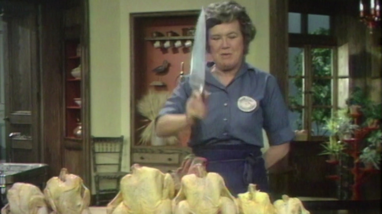 Child combined cooking and fun in a way the world hadn't seen before. What viewers learned from her show "French Chef" was that she wasn't only an incredible chef, but a performer as well. Today, we see plenty of outspoken and witty women leading the culinary industry, but back in the 1960s, the stereotypical homemaker trope was prim, proper, and definitely void of any mistakes. Child squashed that stereotype with her comically large knife and fearless, entertaining ways. "You want amusing things, something fun and unusual," Child shared in regards to doing television (via Smithsonian Magazine). The "fright knife" brought a smile to Child's face as well as the many viewers whenever she swiped it off the magnetic strip and made what she called "whamming noises."