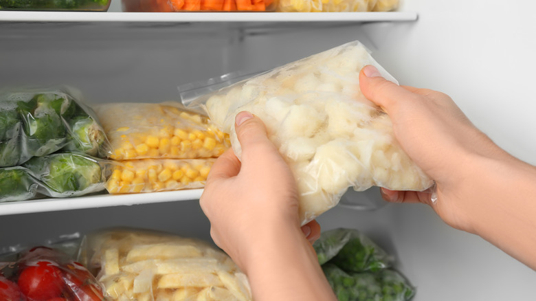 As for freezing logistics, chop cauliflower into florets and blanch, recommends Mccormick. Blanching requires steeping cauliflower in boiling water for about three minutes and subsequently cooling it down in an ice bath. According to BBC Good Food, blanching preserves the vegetable's taste, texture, and nutrients prior to freezing. If you skip this step, it's okay to finely chop florets and then freeze. You'll just want to consume your cauliflower within a few weeks — and in cooked form.