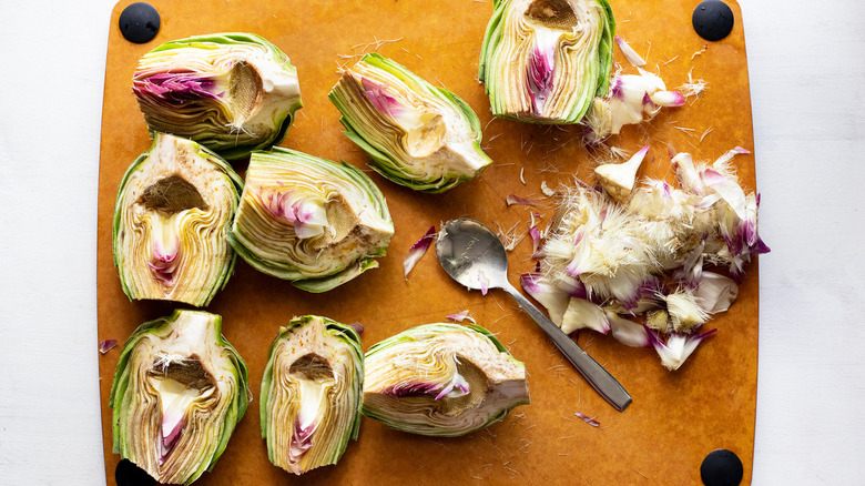 - Slice the artichokes in half, then into quarters. Insert a small spoon at the base of the artichoke's heart and gently remove it, along with any fuzzy leaves. Give each prepped artichoke a rinse.