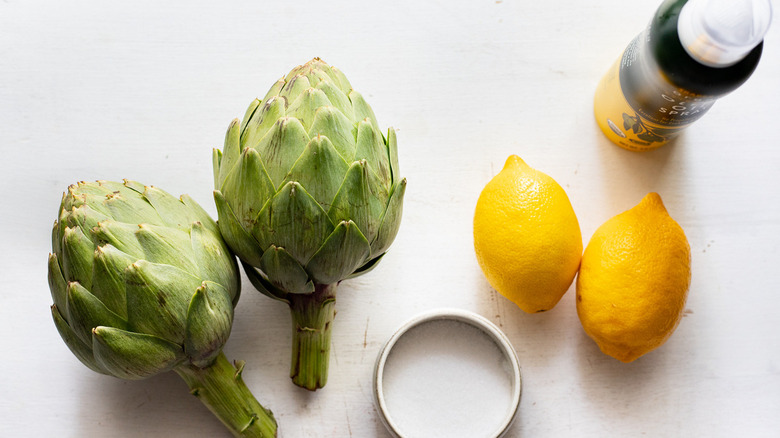 Not only is this recipe perfectly easy and summery, but it requires only four ingredients. You'll need a couple of globe artichokes, of course, along with some sea salt, olive oil spray, and a couple of medium-sized lemons.