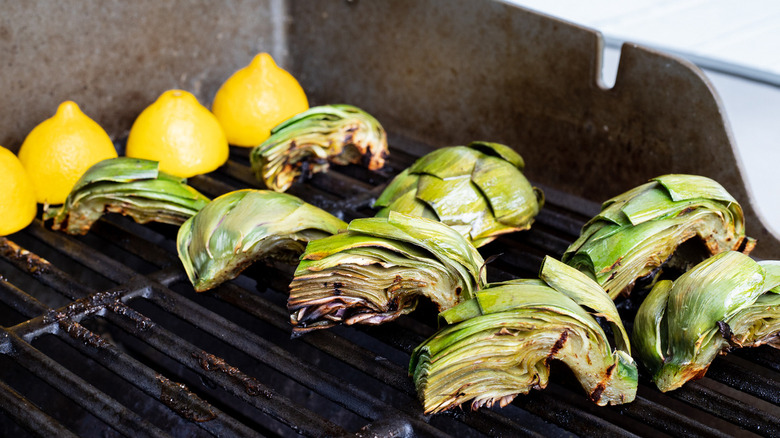 - Cut the lemons in half and place them cut-side down on the grill. Then place the cut sides of the artichokes on the grill and cook everything for 10 minutes, or until the insides are lightly charred.