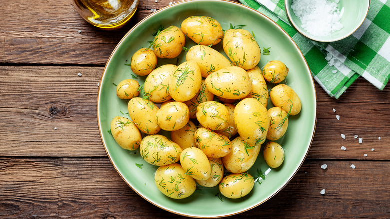 Most potatoes can be put into two categories — waxy or starchy. Higher starch content can break down or become creamier and they're best used when making mashed or baked potatoes. Waxy varieties are the types of potatoes that will hold up better to boiling in water, like when you're making potato salad. Speaking of the popular side dish, nothing is worse than biting into potato salad and getting a mouthful of mushiness. If this is something you've struggled with, before you give up on preparing potato salad from scratch, try adding a bit of vinegar to your pot of water.
