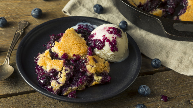 The similarities between a fruit pie and a fruit cobbler are easy to recognize, but the big difference is a little more elusive at first glance. According to Wide Open Eats, pies can have a single bottom crust or both a top and bottom layer, but true cobblers will only feature a top crust. Now, the method of creating that topping is where the magic really happens. Some cobblers are fully-covered by a delicious traditional crust, while others feature biscuit toppings and flavorful accent ingredients, like this huckleberry cobbler with a macadamia nut biscuit crust.