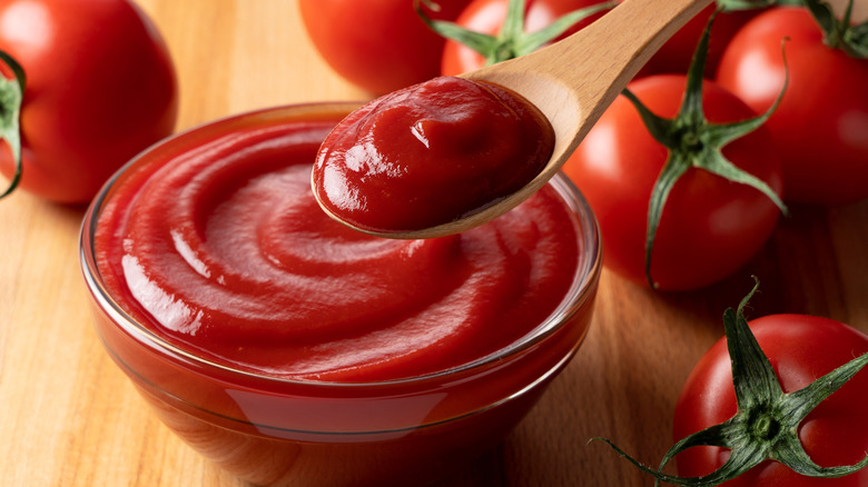 If you find you only have a can of tomato sauce or tomato puree instead of tomato paste, that can also work. Pour the contents of the can into a pan over medium-high heat to reduce the amount of water, but don't walk away from the pot — keep an eye on it. Stir often to ensure it doesn't burn. Then, throw in a splash of balsamic vinegar to give your sauce the sweetness and tart bite of ketchup.