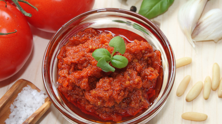Early on, the English enjoyed walnut ketchup, which lent an earthy bitterness to the condiment. Sun-dried tomato pesto often uses the heart-healthy, nutrient-dense tree nut as an alternative to traditional high-fructose corn syrup-filled ketchup. When reviewing the labels of pre-packaged sun-dried tomato pesto options, the standard serving size of two tablespoons includes a bit of fiber and protein, both lacking in typical ketchup, like Heinz. It also has less sodium and a quarter of the amount of sugar. It's perfect for topping chicken, bratwurst, zucchini noodles, or meatballs, but you can also use it as a dip for shrimp, fresh crudités, or veggie chips.