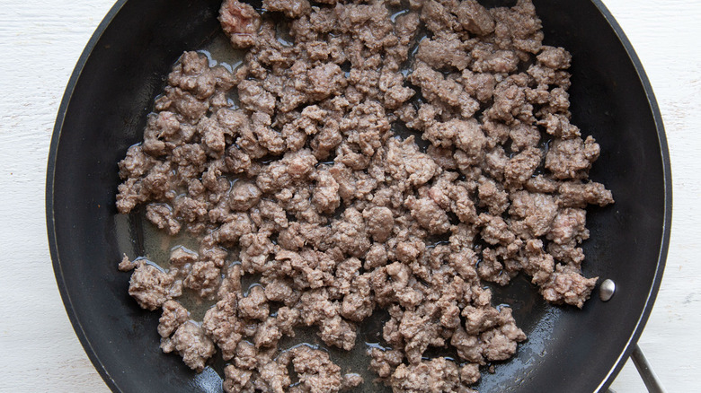 Fry the ground beef over medium heat, breaking up the clumps and stirring it as it cooks. You want the meat to be loose, kind of like taco meat. Once the beef is all browned with no pink remaining to be seen, take it out of the pan — but leave the grease behind.