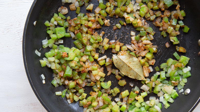 Add the chopped vegetables to the pan and fry them in the grease left over from the ground beef. You'll be cooking these for about 4 to 5 minutes until they start to soften. Stir in the garlic, Cajun seasoning, and bay leaf.