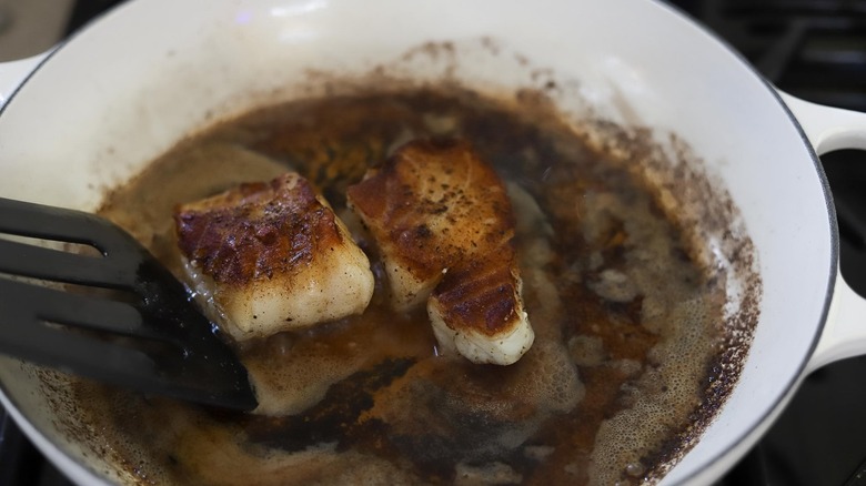 - Melt 4 tablespoons of butter over medium heat, then add the fish once the butter is starting to brown.