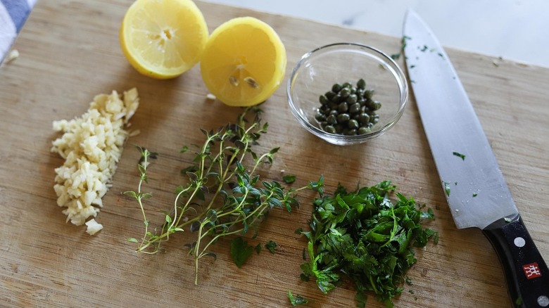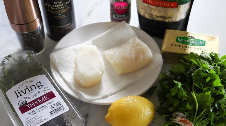 To make this dish, you'll need some Chilean sea bass fillets, salt, pepper, butter, garlic, capers, and thyme. Fresh lemon juice finishes the dish off nicely, although if you want to give it some extra color you can garnish it with parsley, too.