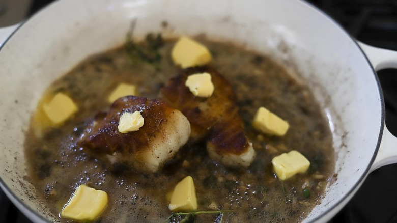 Melt 4 tablespoons of the butter in a pan over medium heat, then add the fish once the butter starts to turn brown. Hondrum notes that you should put the fish in the pan "skin-side down if it has skin." Leave the fish to cook on its own for 6 minutes, then flip the filets and leave them alone for another 4 minutes. Add the garlic, thyme, and capers, then stir those around the pan for 2 more minutes before turning off the heat. Check the fish to see if it's done. When it is, it should be opaque and easy to flake with a fork. If you want to check it with a meat thermometer, that should read 145 F.