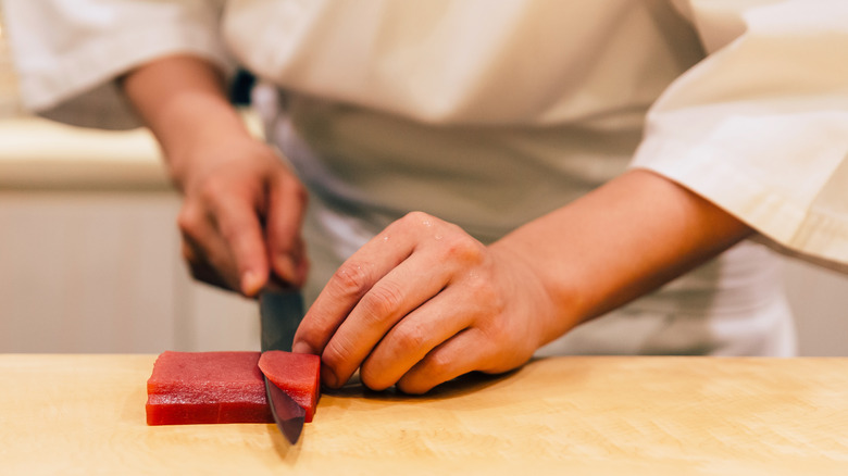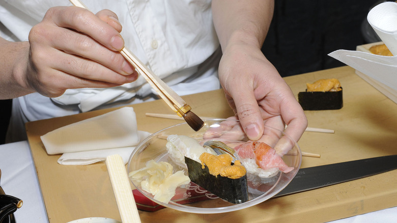 Situated near an underground subway station, Ono's 10-seat sushi bar catapulted to culinary acclaim. Inside his restaurant, pre-flavored sushi dishes are served simply, placed onto black plates, and presented with instructions for diners to eat quickly in order to experience the intended flavors (via Japan Wireless). According to Sushi Jiro's website, the experience is "not like visiting a tourist attraction," and diners pay a minimum of 55,000 yen to sit for lunch or dinner.