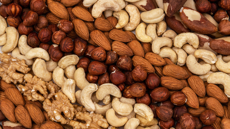 Though technically legumes, peanuts are classified as nuts as far as nutrition goes (according to Healthline). The U.S. Department of Agriculture's FoodData Central lists a 100-gram serving of unroasted peanuts as having 25.8 grams of protein; dry-roasted almonds with salt, by comparison, contain 20.4 grams. Protein isn't the only draw, however — peanuts contain folate (as recorded by Harvard's School of Public Health) and also have a lot of antioxidants, amino acids, and minerals.