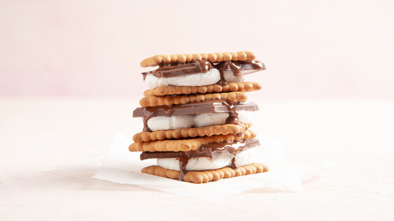 S'mores are a campfire classic made with a combination of crunchy graham crackers, melty chocolate, and puffy marshmallow. According to Camping for Foodies, there are many ways to jazz up the traditional s'mores to include some adult flavors — most of which include peanut butter. Consider swiping peanut butter on a graham cracker before adding chocolate and roasted marshmallow. Or, substitute a peanut butter cup for the square of Hershey's chocolate on the s'more. Although this might seem like the perfect ratio of peanut butter to chocolate, use a Reese's thin instead of a traditional peanut butter cup for maximum Reese's goodness.