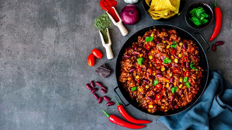 You see it on chili cheese dogs, mixed in with mac and cheese, or over pasta if you're in Cincinnati, Ohio. That's because chili is versatile enough to be eaten on its own or within other dishes, and it's quite hearty to boot. Known for its smoky and meaty flavors, chili is often made with a blend of colorful seasonings, such as chili powder, ground cumin, ground oregano, and cayenne pepper, according to Food Network. These are mixed with ground meat, like beef or turkey, as well as peppers and on occasion, beans.