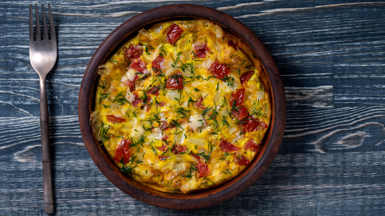 Surprisingly, frittatas are easy to make in your rice cooker (via Southern Home Express). You don't need to mess with a hot oven or stand over a steaming stove; instead, load up all of your goodies in your rice cooker and let it do the rest. You only need a rice cooker and an outlet to make this simple egg dish with a fancy Italian name.