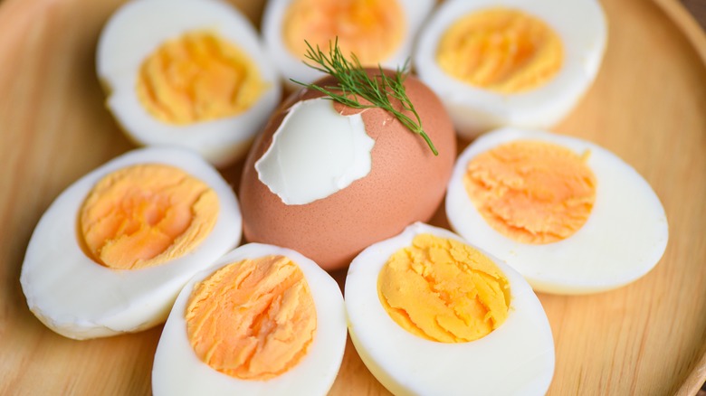 Hard-boiled eggs are high in protein and make an excellent portable snack (via Healthline). Keep hard-boiled eggs in your refrigerator for a robust pre-or post-workout meal. While you wouldn't carry around a plate of scrambled eggs, a hard-boiled egg is easy. Just throw a couple in your bag, and off you go.