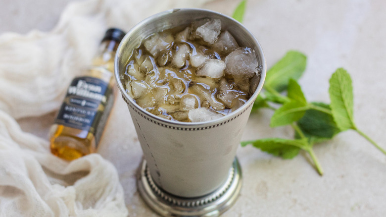 Once you've selected the appropriate cup, put 2 tablespoons of the mint syrup in the bottom of the glass along with the remaining mint leaves. Muddle or stir the mint together with the syrup, crushing it to release the mint oils. Fill the glass with crushed ice, then pour the bourbon over the top. Add more ice if needed. If you have more mint sprigs on hand, use these as a garnish.