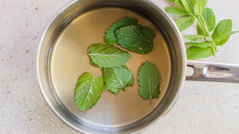 Mix the water and sugar and cook over medium heat, stirring, until the syrup comes to a boil. Turn the heat down and simmer the syrup until all of the sugar dissolves. Turn off the heat, then put six mint leaves into the syrup. Let the mint infuse the syrup as it cools down, making sure they stay in for at least 10 minutes.