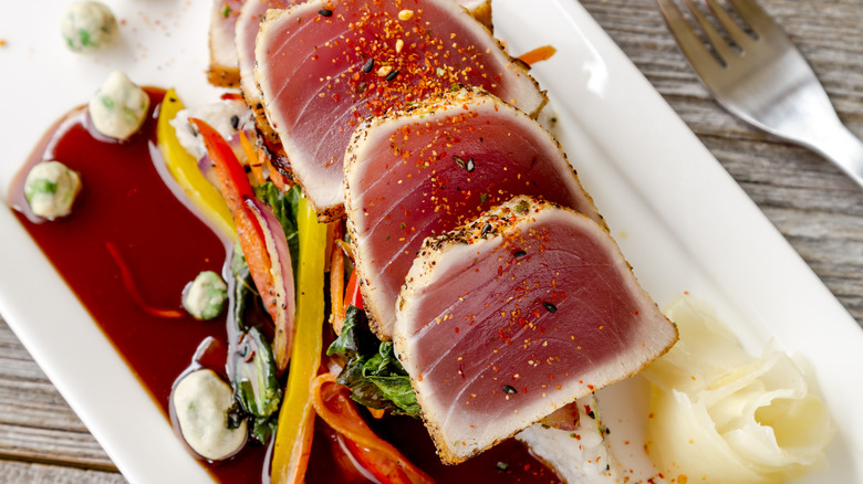 Ahi (aka yellowfin or bigeye) tuna can be served in a variety of dishes and preparations, from vibrant Hawaiian poke bowls featuring fresh cucumbers and jalapeños to earthy, sweet-savory tuna-mushroom skewers. Ahi tuna is also delicious served up simply, like as a seared tuna steak, though achieving that perfect sear may take a little practice. The last thing a cook wants is to ruin a lovely piece of ahi tuna, and there are a number of traps that can lead to disappointment on the plate. Fortunately, achieving the ideal sear isn't difficult if you follow a few best practices.