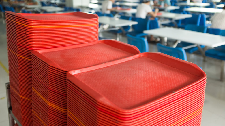 So what is the germiest place in a restaurant? While most people might guess the bathroom or the floor, NSF suggests it's actually plastic cafeteria trays, which are common at buffets, quick service restaurants, and food halls. These findings, which suggested trays contain over 200 bacteria per square inch, corroborate data from Lysol, which named cafeteria trays as the second germiest spots in schools behind bathroom doors. The NSF study suggests that those plastic trays we stack our food on and carry to our tables before digging in have more bacteria than public bathrooms, school bus seats, and virtually anything in a doctor's office. Only three other surfaces in the study were found to have more bacteria: school musical instruments, theater arcade game controllers, and playground sandboxes (which topped the list with a whopping count of 7,440 bacteria, mold, and yeast per gram of sand).