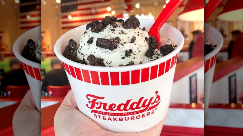 Freddy's Frozen Custard & Steakburgers is an international oasis of comfort-food classics like huge meaty burgers and luscious custard with toppings swirled into its dense chocolate or vanilla base. Rapidly expanding throughout the U.S. (via Biz Journals) and abroad, Freddy's Frozen Custard & Steakburgers seems committed to covering the entire world in its glorious version of delectable custard and "concretes" (frozen custard with toppings mixed in).