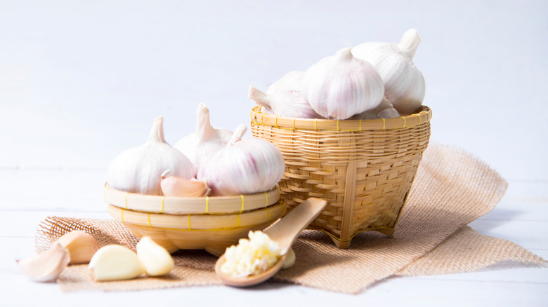 Garlic is a remarkably resilient vegetable: Healthline states that, if stored properly, unpeeled garlic will last up to six months. Proper storage means keeping your cloves in a dry, well-ventilated space, ideally between 60º F and 65º F. To help keep your garlic fresh, you can use a basket, a garlic keeper, or a covered bowl with holes for ventilation. You can also freeze it, though frozen garlic isn't as tasty as fresh.