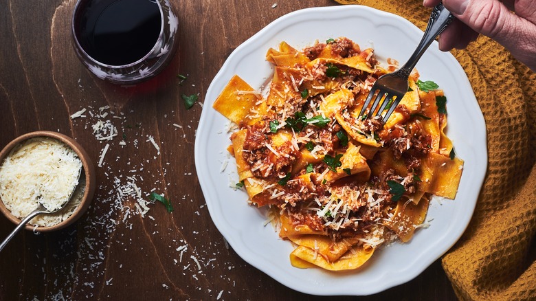 According to Grapes & Grains, bolognese sauce in Italy is called ragù alla bolognese, originating in Bologna, Italy. The sauce is universally loved and splits its time evenly between two pasta shapes: rigatoni and tagliatelle. While rigatoni has large openings for chunks of meat to fit right in, tagliatelle almost acts as a deconstructed lasagna noodle to fold around the meat with your fork for a perfect bite. Alpine Bakery states that ragù uses essentially the same ingredients as bolognese, just with different ratios, and that wide, flat noodles are the best vehicle to carry such a hearty, meaty sauce.