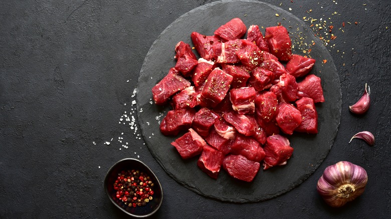 It makes sense that shish kebabs' roots trace far back. It's a simple dish spread through nomadic cultures (via Bodrum) and adapted to ingredients from around the world. Although traditionally prepared in Turkey using lamb or mutton, other proteins like beef, chicken, seafood (like swordfish steaks), alongside veggies (like peppers, tomatoes, and zucchini) are also fit for the skewer. Since fire-cooked meat is prone to drying out, it's essential to pick a cut with enough fat to keep it juicy, but won't prolong the cooking time, states Masterclass. So when preparing shish kebabs using beef, what's the best cut to use? Let's break it down.