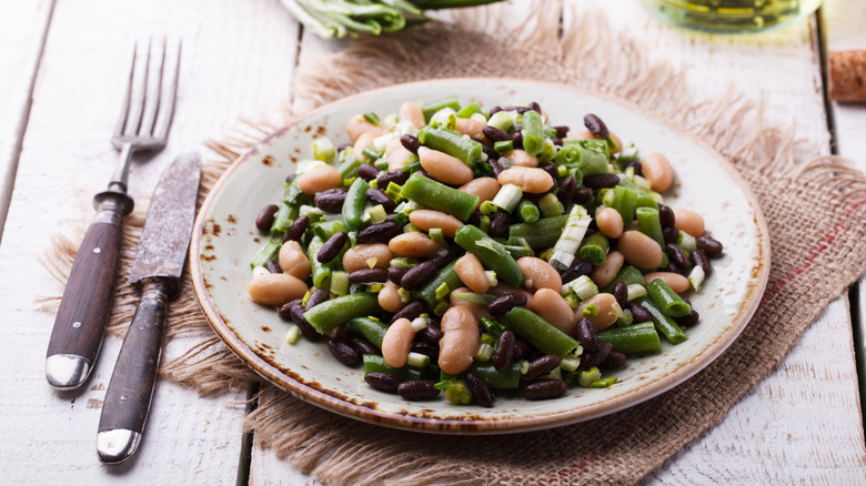 This effortless salad can be tuned up or down, depending on your preferences and your taste. For those who truly want their three bean salad to be filled only with actual beans, try kidney, great northern, and garbanzo beans instead. If you love a sharp taste and vibrant hues, add a red onion strewn amongst the beans. And for folks who like to crank up the flavor to 11 try dousing your beans in Italian dressing or giving it a Mexican twist, exchanging black or pinto beans for green and adding corn, bell peppers, and little cilantro and lime to the mix. If freshness is your thing and you've got a few extra hours on your hands, you can skip the cans and cook the beans yourself, opting for fresh green beans and dried kidney or garbanzos.