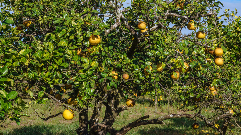 Second only to oranges as a beloved breakfast fruit, grapefruits yield a bunch– both in terms of how they grow and their nutrients. A powerful detoxifier, they pack a vitamin C punch, providing 64% of the necessary daily intake from only one fruit, according to Healthline. Their sour, slightly bitter, and sweet flavor makes for an underrated salad addition or a nutritious boost for a healthy tonic. Yet grapefruits' origins is somewhat of a mystery. Unlike most citrus fruit, which originated in Southeast Asia (via Nature), grapefruit is believed to have emerged in Barbados, per Britannica.