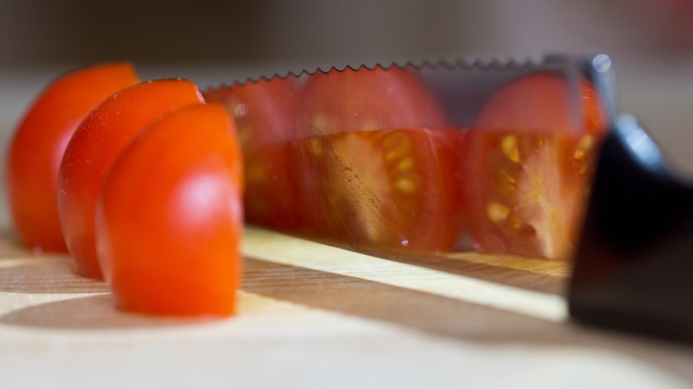 It may not be obvious at first, but tomatoes can be quite cumbersome when it comes to slicing. Unlike a cucumber, an apple, or a head of lettuce, tomatoes frequently do not lend themselves to neat cuts with a standard knife. The best thing to do for your slicing and dicing needs is to reach for a serrated knife. (Specifically, superstar chef Thomas Keller recommends using a bread knife to cut tomatoes.) The sharp teeth on a serrated blade can help you cleanly break into the flesh, avoiding an ugly or a messy cut.