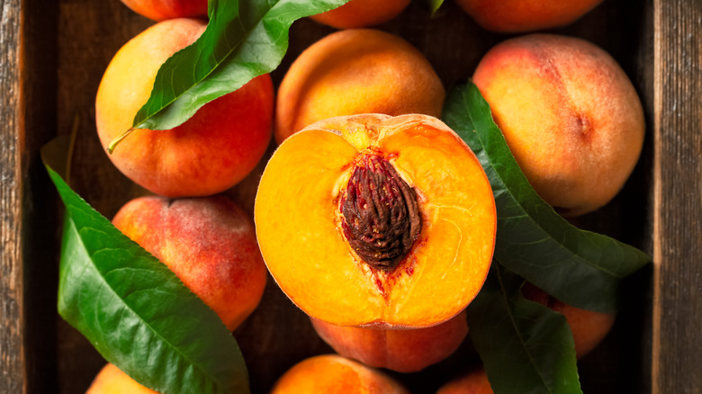 Not only are yellow peaches delicious, but they're also an aesthetically-pleasing visual kaleidoscope of color. They have a dark red center around the pit, says Taste of Home, and the yellow flesh darkens to a deeper yellow as they ripen and become sweeter. They're practical, too — yellow peaches, it says, are also ideal for canning because they hold their shape well under heat.