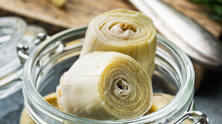 If you can get past that tough, threatening exterior (and interior), you'll find a great-tasting vegetable full of nutrition. According to Healthline, artichokes are high in Vitamins C and K, and magnesium is the highest among vegetables for antioxidants. They also go great in dips, sandwiches, or as entrees with parsley and pancetta. They can also be a lot of work to prepare safely. Luckily, there are plenty of frozen, canned, or marinated options, but can they substitute for a fresh artichoke heart?