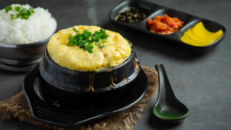 Flavors and textures aside, such a simple side dish also scores an A+ on the presentation scale. As the food blog The Subversive Table explains, gyeranjjim is usually the last side dish to be presented and is known for its soufflé-like aesthetic as it puffs up from its ttukbaegi. The bright yellow eggs also serve as a sharp color contrast to the black or brown pot it's presented in.