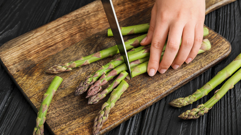 If you are somewhat experienced in the kitchen and have worked with asparagus before, you've probably heard of the bend-and-snap approach. This method is where you hold a single stalk by each end and bend it until it "naturally" snaps (via The Spruce Eats). In theory, where the asparagus snaps is where the woody part of the stalk ends and the softer, more edible part of the vegetable begins. This is a common way for most people to learn where to cut asparagus. However, Serious Eats did an experiment, challenging the traditional bend-and-snap method. According to the outlet, the bend-and-snap technique is too variable. A quicker, more consistent way to split the asparagus is by looking at where the vegetable becomes stiffer and woodier. It may even be significantly paler than the rest of the stalk. Then cut along that visual line.