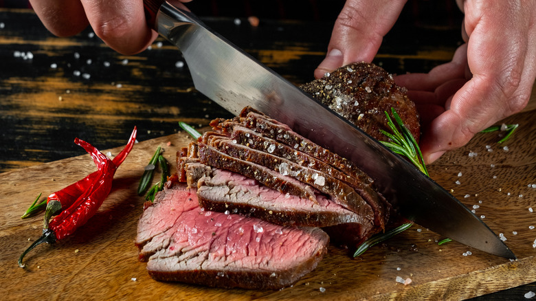 For starters, cutting into your meat while it's still cooking isn't a reliable way to judge if it is finished cooking. According to Food52, once you cut into your meat the fats and juices that contain the most delicious flavors are going to pour out. Every time you cut into a steak to check if it's still pink, you're losing more flavor. Secondly, your meat will not finish cooking completely until it's had time to rest. According to Angie Mar, co-owner and executive chef of The Beatrice Inn, it's best to let meat rest before it's reached its final temperature. The residual heat will finish cooking the meat while it rests, and also redistribute all of the juices.