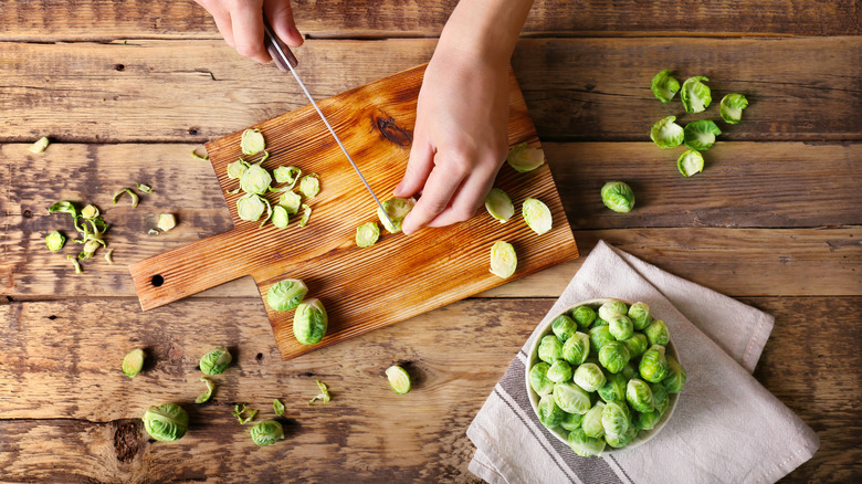 When preparing Brussels sprouts at home, you can sometimes end up disappointed with the outcome — and it's usually because they're not crispy enough. From trimming to tossing them, there are a few hacks for preparing Brussels sprouts yourself. However, if your goal is to get them as crispy as they are when you eat them in a restaurant, there is one critical step you must follow. In order to get that nice charred sear, you must increase the sprout's surface area. How do you do that? You simply cut it in half.