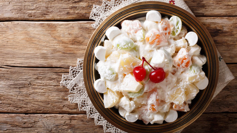 Ambrosia dessert (also called salad) triggers derision and debate, yet the fluffy medley remains one of the world's ten most popular fruit salads, a potluck staple, and a cherished Southern tradition, according to Taste Atlas. Calorically loaded and easy to make, Los Angeles Times reports the dish "closely treads the line between melange and mess" so much, in fact, that many restaurateurs assert ambrosia is too old-fashioned, costly, and impractical to serve. For some like Daniel Davis, the dish provokes disdain, with hesitant spoonfuls chased by immediate gulps of water (per NPR). Yet for others, ambrosia is the perfect offering for summer gatherings, a brightly-colored presentation that adds a touch of festivity to table spreads (via The Six Figure Dish).