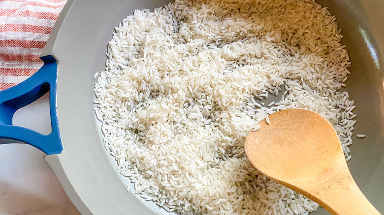 - Add the rice and stir frequently for 2 minutes to toast the rice.