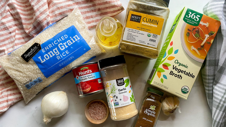 This recipe only requires a few items, and you may have many of them in your kitchen already. You'll need oil, long-grain white rice, broth, white onion, garlic, canned tomato sauce, cumin, garlic granules, salt, and chili powder. There is also one optional ingredient — cayenne pepper, if you like your rice spicy.