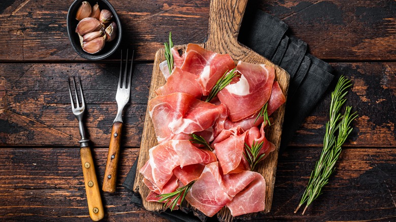 The dry-cured uncooked cut of light pink meat that you're thinking of is technically called prosciutto crudo in Italian, while the baked version of the pig leg is called prosciutto cotto, per The Spruce Eats. What you see at the store or in your local butcher shop is just the slicing and the packaging of the prosciutto — seems easy enough — but according to Serious Eats, the most meticulous of meat artists take somewhere between 18 and 24 months (sometimes even longer) to fully prepare prosciutto. It's actually a very simple process on paper, just the hind leg of a pig salt-cured and then air-dried for a very, very long time, Bon Appétit reports. But perhaps the wait makes it taste even better.