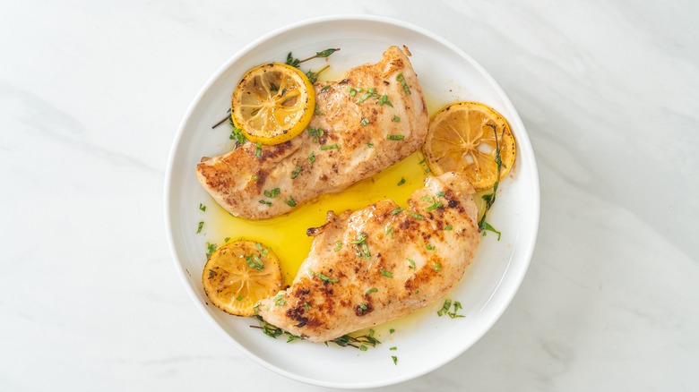 Another great trick for cooking with lemon is to make a flavorful compound butter. This easy yet oh-so-tasty cooking technique is a favorite among chefs who use it to coax flavor out of meat and vegetables using simple ingredients. Compound butter is simple to make — just soften some butter and fold in a combination of salt, pepper, spices, citrus zest, or herbs. Then, chill the butter into a log using parchment paper. When it's time to cook, just slice off a chunk as needed. It will keep this way in your refrigerator for at least a week, longer in the freezer.
