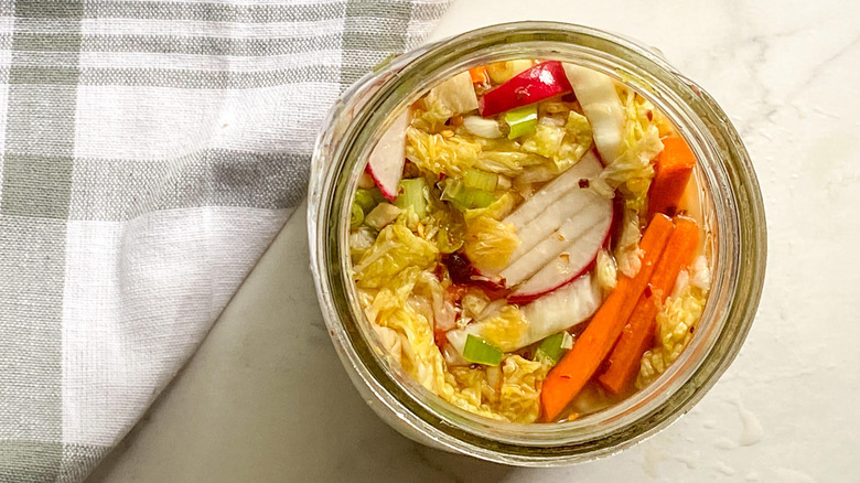 In addition to the foods, you'll also need supplies for the fermenting process. In this case, Hahn notes that you'll need a 32-ounce Mason jar, a wooden mallet, and a glass sauerkraut weight. She admits it's possible to get by without the specialized tools — for instance, if you don't have the sauerkraut weight, you can get away with using a large leaf of cabbage reserved from the head of cabbage you're fermenting — but says if you want to make kimchi regularly, it's best to invest in the appropriate fermenting tools.