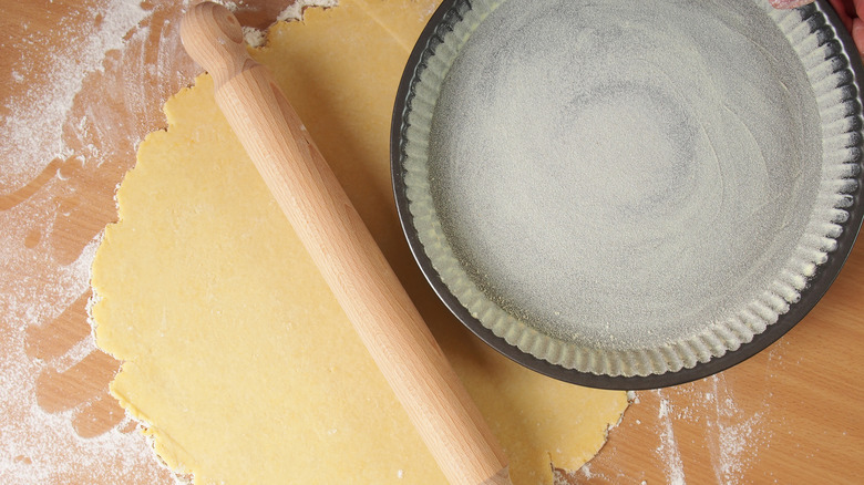 Pie pans typically come in three varieties — ceramic, glass, and metal, per Martha Stewart. For a crisp, flaky, golden-brown crust, your best bet is the metal option, also known as a pie tin. They are typically made from aluminum, which conducts heat quickly. Glass dishes are another favorite with bakers because you can see right through them to observe the browning of the crust. They heat up slightly slower than metal but faster than ceramic, which is the key to achieving a perfectly-cooked crust.