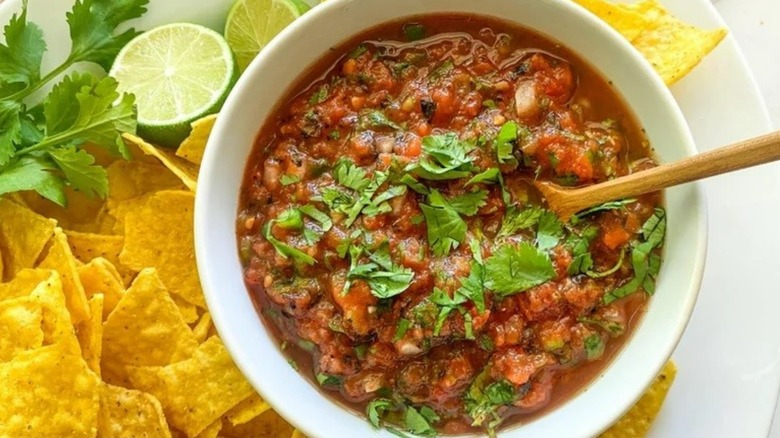 According to The Association for Dressings and Sauces (yes, it's a real thing), salsa can be traced back to the Aztec civilization, and literally translates to "sauce" in Spanish. As per its name, salsa isn't just a banging dip for tortilla chips; it's also great on eggs, potatoes, grilled chicken, fajitas, and even seafood boils. The lime juice, onions, and tomatoes in most salsa recipes are a great source of vitamin C, according to Healthline. Their natural water content also makes salsa super hydrating.