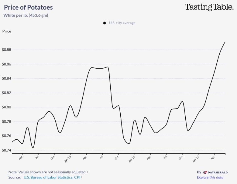 Tasting Table compared data for the price of potatoes from February 2019 to June 2022 sourced from the U.S. Bureau of Labor Statistics (BLS). The BLS Consumer Price Index measures the average change over time of staple consumer goods in major U.S. cities, including utilities, gasoline, and food. As shown by the data, the average price per pound of white potatoes was about $0.75 back in February 2019. By April 2020, that price increased a full $0.10 to $0.85 a pound, a 13% increase. After dipping back down slightly throughout much of last year, potato prices started climbing again in early 2022. As of this June, the average price of white potatoes had climbed to a hefty $0.89 per pound. That is a 15.86% increase over June of last year and a 19.9% increase from June 2020.