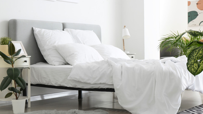 Freshen up your bedroom with ... vodka? Vodka has virtually no odor (especially compared to stronger-smelling drinks like wine or beer), and thanks to its high alcohol content, it's a natural disinfectant. Brew up your signature linen spray by blending your favorite essential oils with vodka as a base in a spray bottle. For better sleep, mix in essential oils that smell great and promote relaxation, including lavender, clary sage, chamomile, lemon, lime, sandalwood, and ylang-ylang (via Medical News Today).